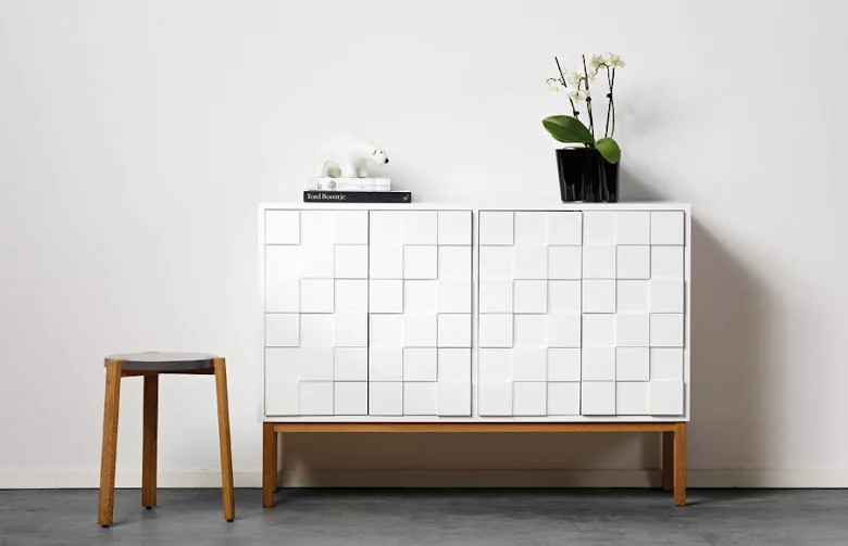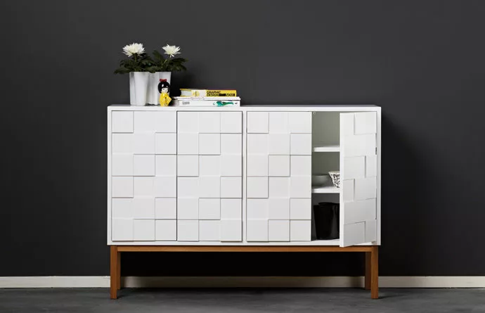 Det vita skĂ„pet Àr en modern möbel med ett klassiskt uttryck.  De tvĂ„ dörrarna öppnas med sk ”pushfunktion”. Bakom varje dörr finns tvĂ„ hyllplan.