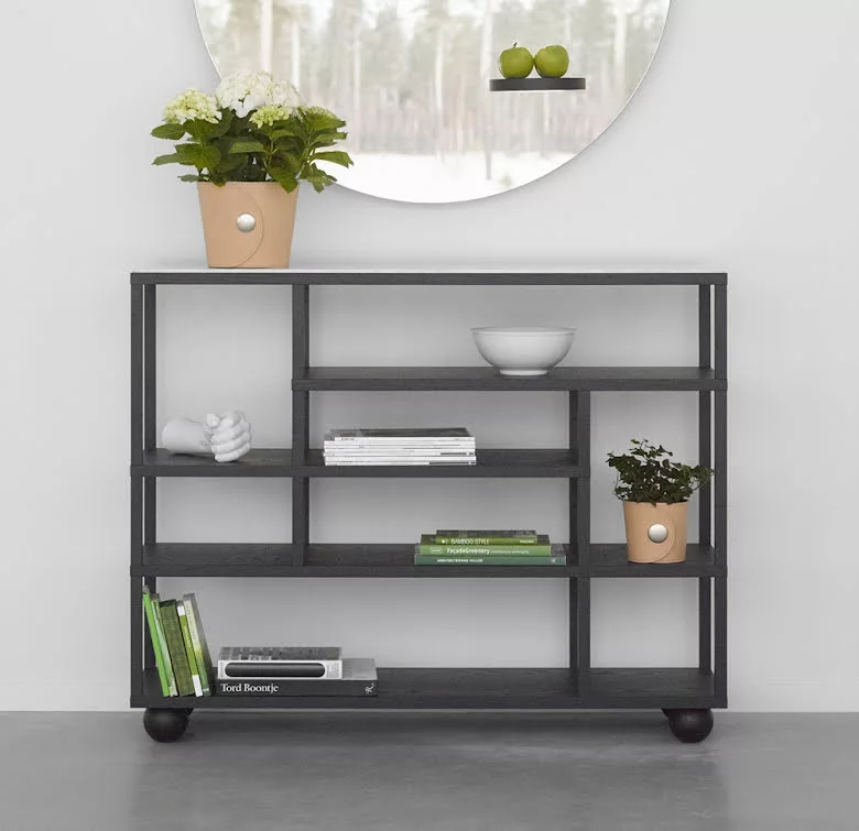 En öppen hylla med ett distinkt grafiskt uttryck kombinerat med vackra material. Designen Ă€r luftig och Show lĂ€mpar sig bĂ„de som en fristĂ„ende hylla och placerad mot vĂ€gg.Â