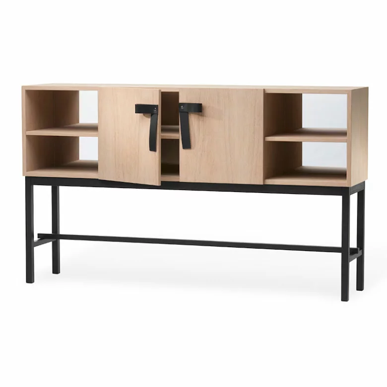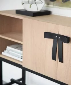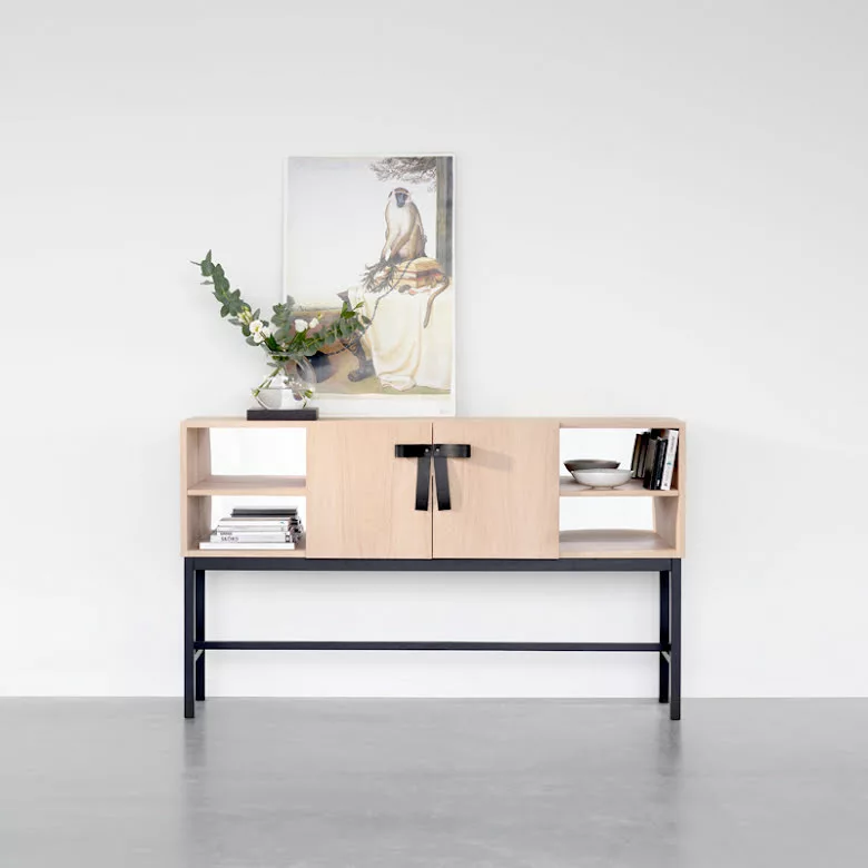 The bow sideboard Àr en unik skÀnk designad av Sara Larsson för svenska A2 designers. SkÀnken i sig Àr stilsÀker och minimalistisk gjord i ek med en ram av svartbetsad ek medan det största fokuset ligger pÄ den vackra rosetten i svart TÀrnsjölÀder som pryder skÀnkens mitt. The bow sideboard kombinerar öppen och gömd förvaring och bjuder pÄ en överraskning nÀr dörrarna öppnas, för pÄ bakre vÀggen finns en spegelvÀgg som effektfullt skapar rymd och framhÀver favoritsakerna du placerat pÄ hyllorna.