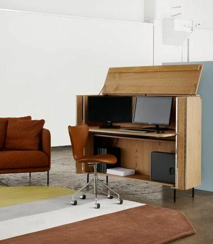 Fokus, designad av Mikko Laakkonen, ser ut som ett traditionellt skåp men gömt inuti finns ett höj- och sänkbart skrivbord och förvaringsutrymme för dator, skrivare och annat material som behövs för ditt hemmakontor.