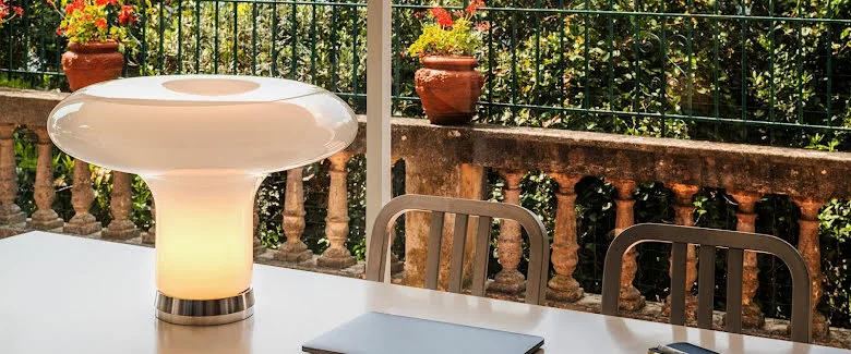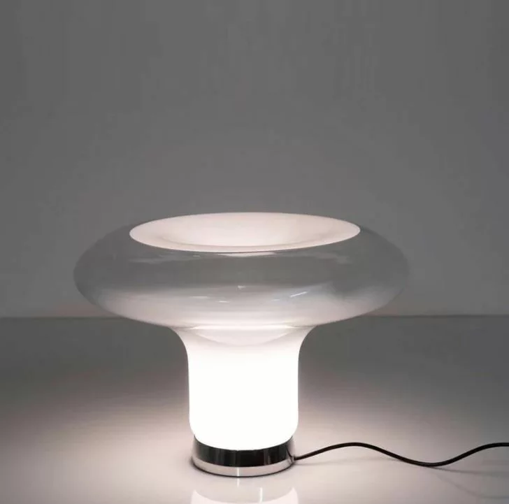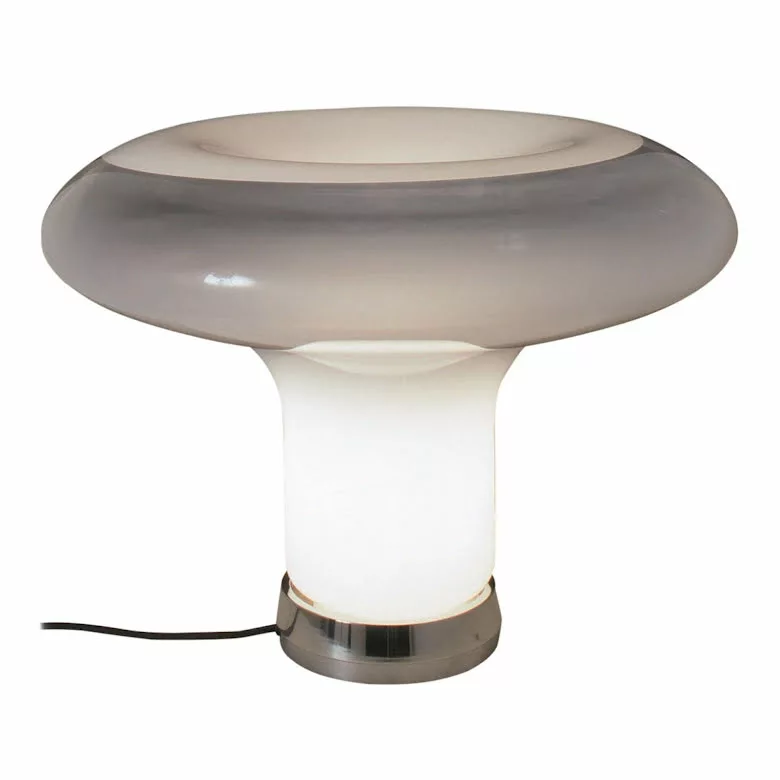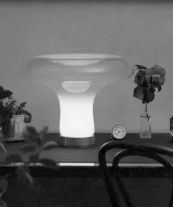 Bordslampan Lesbo, designad av Angelo Mangiarotti Ă„r 1967 för Artemide, Ă€r en skulptural lampa gjord av glas med en polerad, ringformad metallbas. Glaset som Ă€r vitt med en lĂ€tt rökfĂ€rgad nyans ger ifrĂ„n sig ett behagligt, diffust ljus och riktar Ă€ven skenet uppĂ„t vilket gör den idealisk att stĂ€lla pĂ„ nattduksbordet eller ett sidobord. Lampan har en integrerad dimmer pĂ„ kabeln och krĂ€ver dĂ€rför en dimbar ljuskĂ€lla.Â