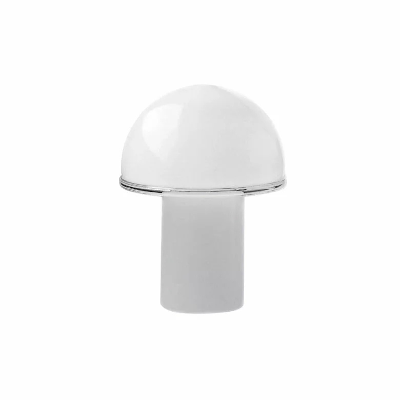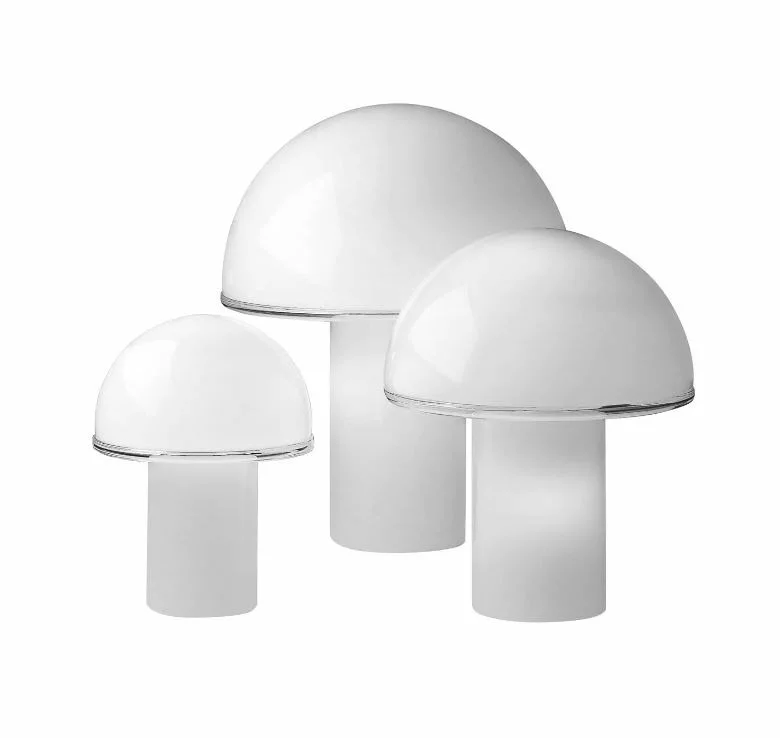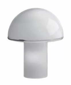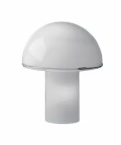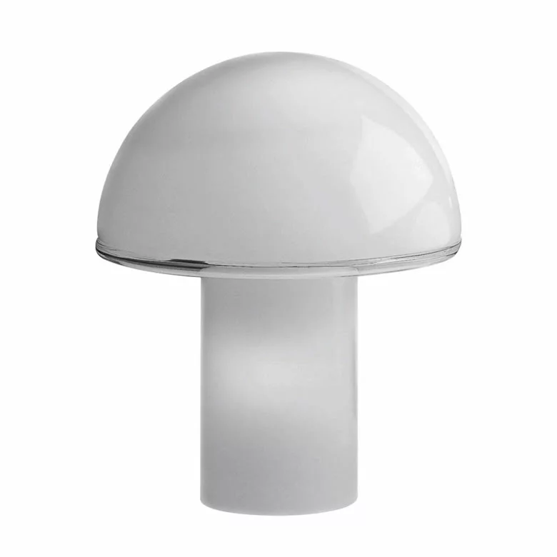 Onfale bordslampa Ă€r formgiven av Luciano Vistosi Ă„r 1978 för italienska Artemide. Den svampformade lampan Ă€r tillverkad helt av opalinblĂ„st glas vilket avger ett behagligt sken frĂ„n armaturen. SkĂ€rmen Ă€r dekorerad med en stilfull kant av kristallglas som bidrar till Onfales eleganta och exklusiva uttryck. Onfale finns i tre storlekar: Piccolo, Medio och GrandeÂ