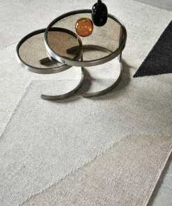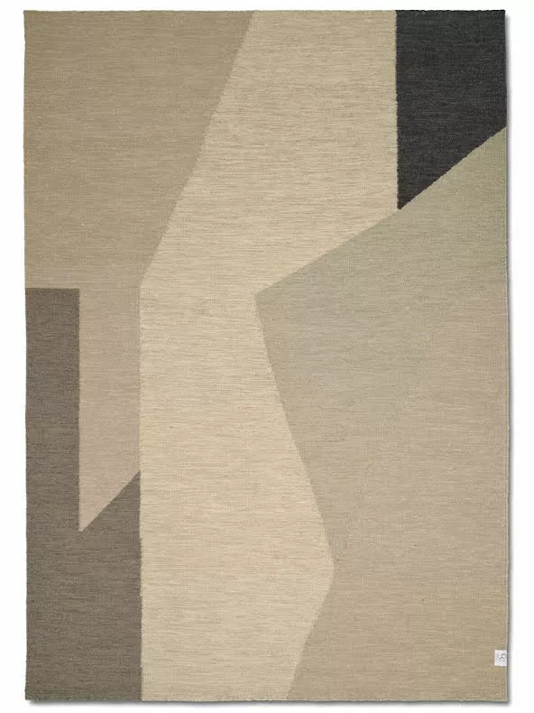 En slÀtvÀvd ullmatta med olikfÀrgade fÀlt som tillsammans bildar ett geometriskt mönster över hela mattan.