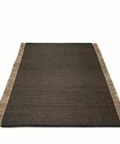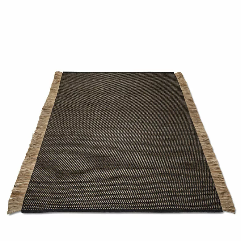 FlatvÀvd matta i svart bomull och jute. Mattan Àr vÀndbar, ena sidan Àr av svart bomull och andra sidan av jute med inslag av svart bomull. Frans av jute pÄ bÄda mattans lÄngsidor.