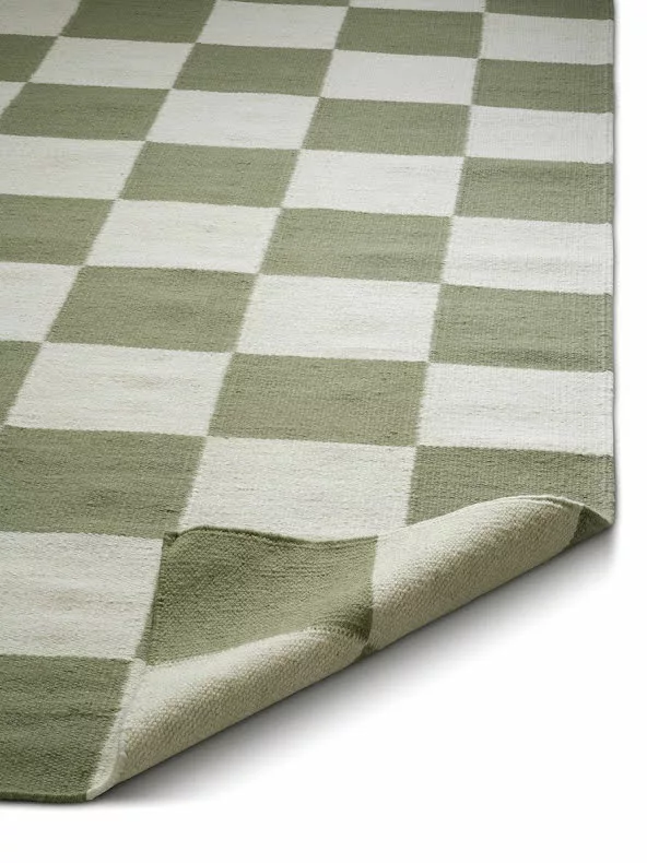 En slätvävd ullmatta med ett symmetriskt rutmönster i två färger över hela mattan. Squares finns i två färgställningar; vit/natur eller vit/grön.