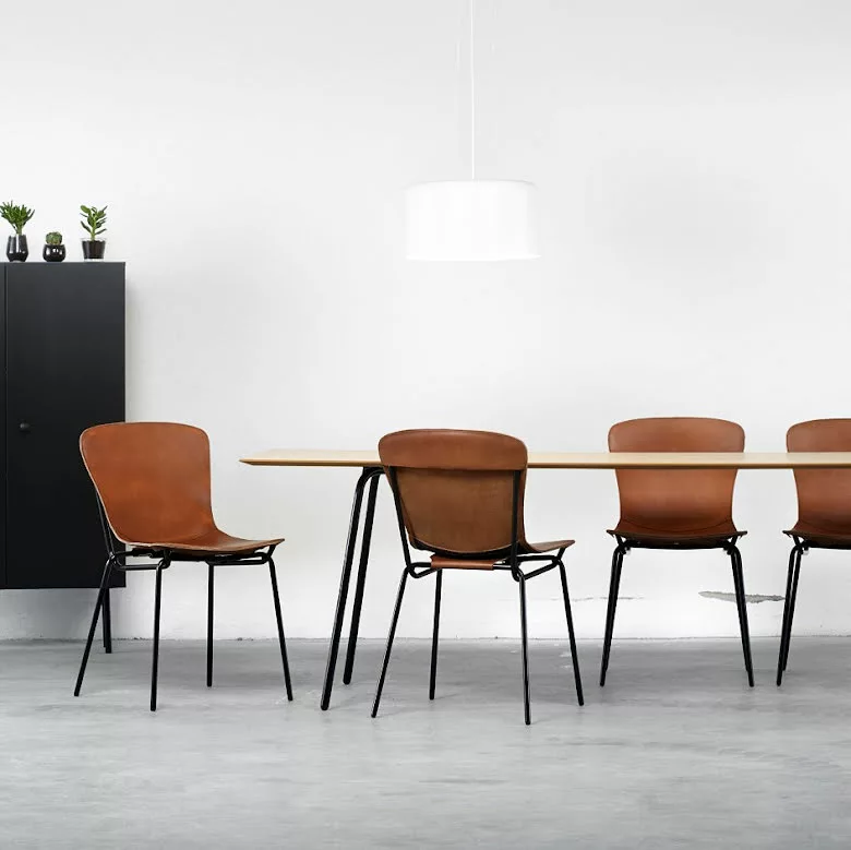 Material: Vegetabiliskt garvat lĂ€der i svart, brun, cognac eller natur. Kromat eller svartlackat stĂ„lstativ.Â