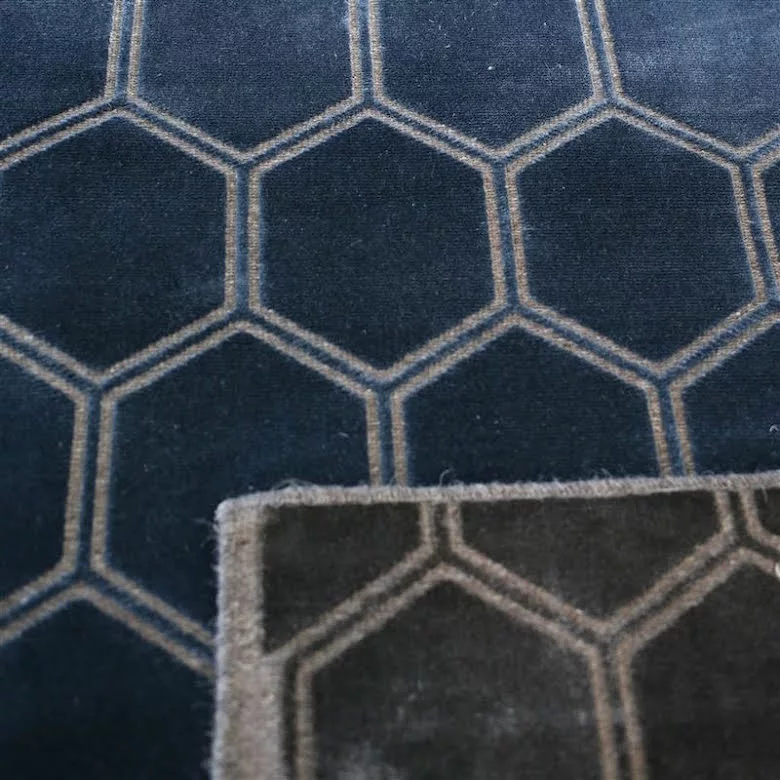 Manipur Delft gångmatta har ett mönster från det underbara Manipur-sammetstyget. Mattan har en vacker midnattsblå med ett vävt hexagonmönster i skimrande sammet mot en bakgrund i ull. Den är vävd på speciella jaquard-vävstolar i Belgien och har en anti-slip behandling på baksidan.