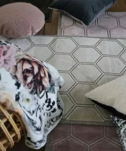 Manipur Natural gångmatta har ett mönster från det underbara Manipur-sammetstyget. Mattan har en ljus cremebeige ton med ett vävt hexagonmönster i skimrande sammet mot en bakgrund i ull. Den är vävd på speciella jaquard-vävstolar i Belgien och har en anti-slip behandling på baksidan.