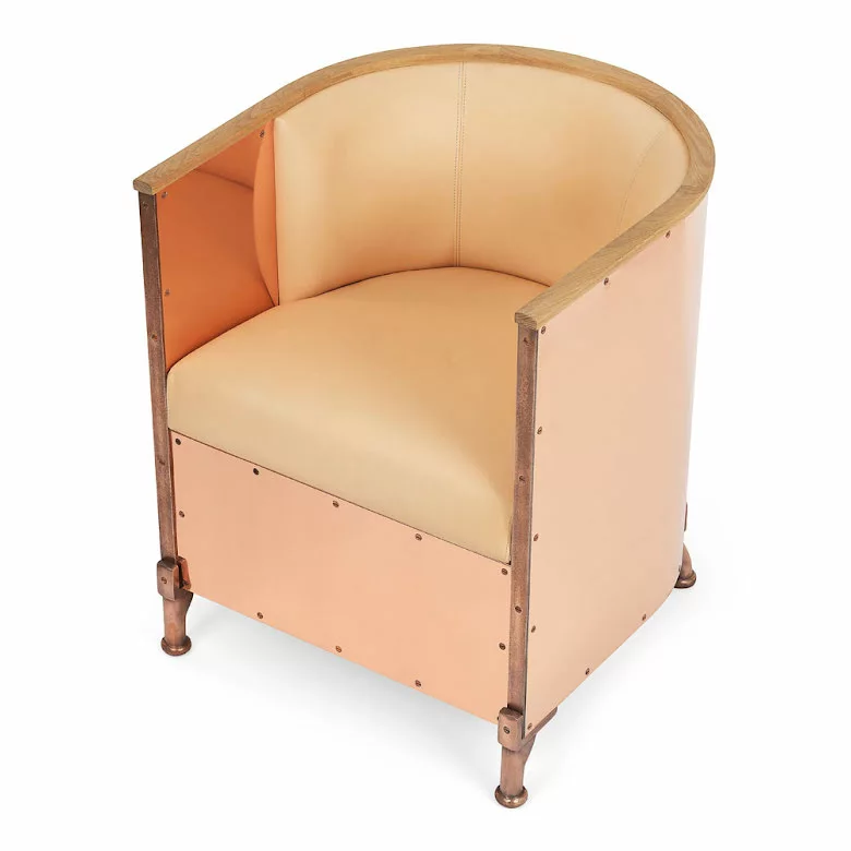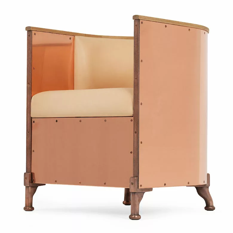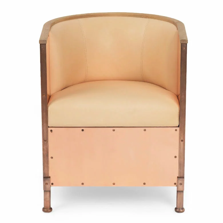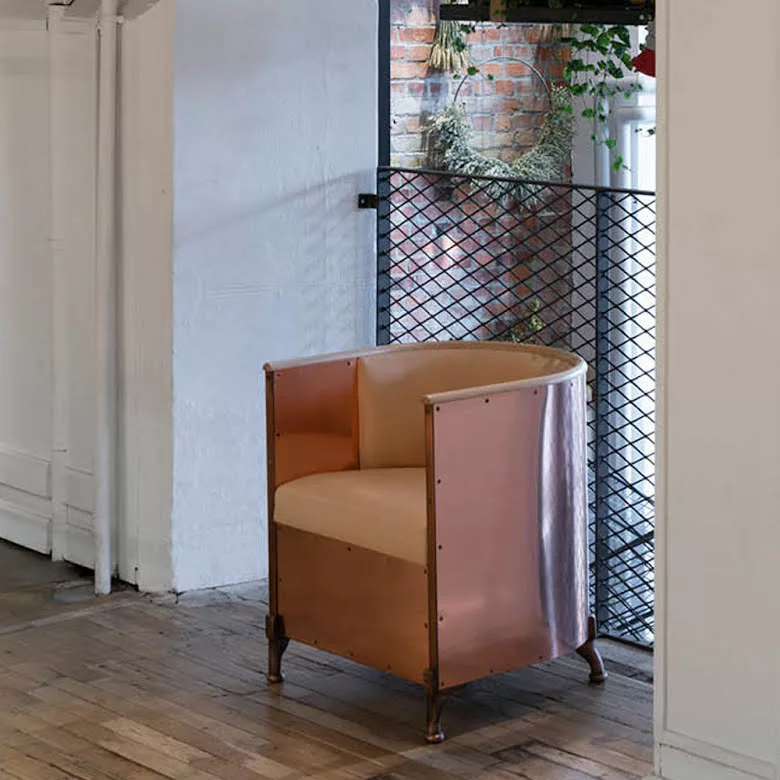 Material: Kopparplåt, kopparbehandlade ben, Tärnsjöläder, karm i naturell bok, rygg och sits i kallskum.