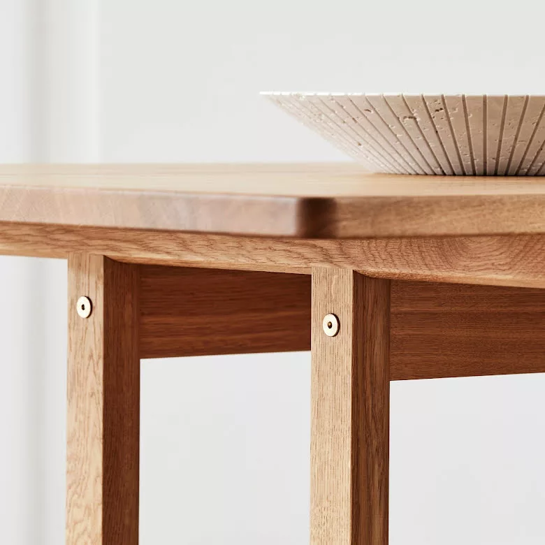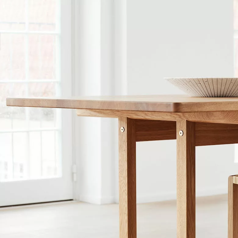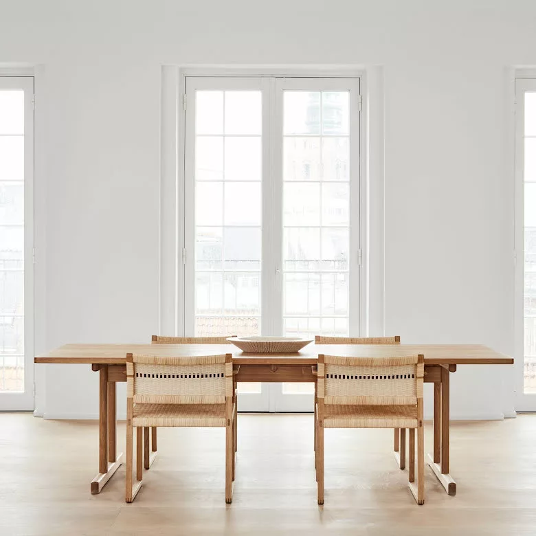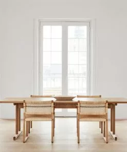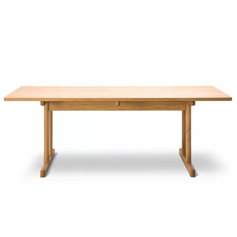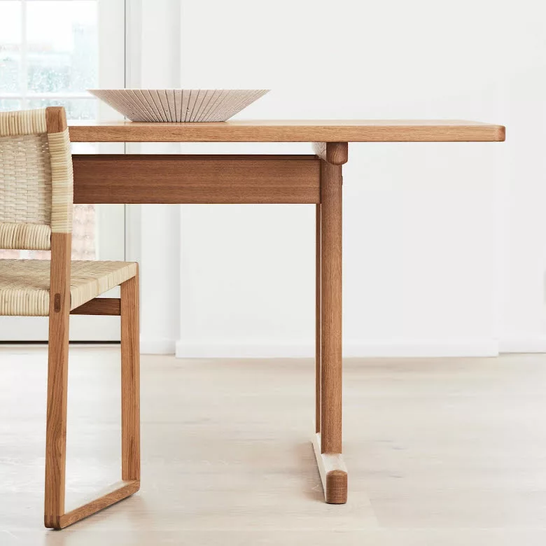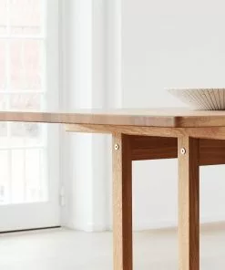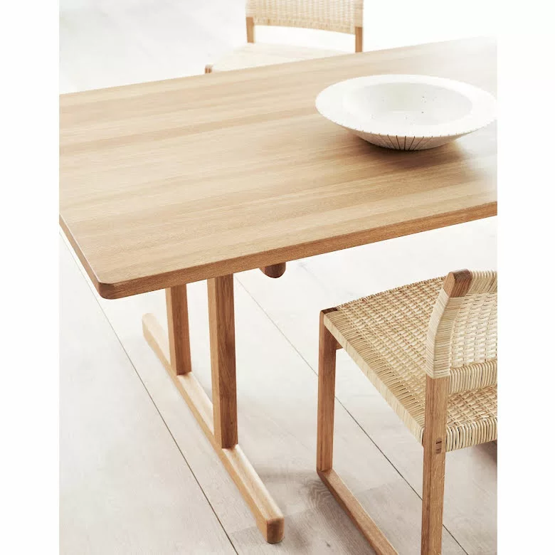 Det massiva ekbordet designat av BĂžrge Mogensen 1964 var det sista i en rad matbord inspirerade av den funktionalistiska möbeltraditionen frĂ„n den amerikanska Shaker-rörelsen. De övergripande mĂ„tten och tjockleken pĂ„ bordsskivan Ă€r större Ă€n pĂ„ de tidigare borden. Resultatet Ă€r en exklusiv och majestĂ€tisk karaktĂ€r, vilket ytterligare framhĂ€vs av ett kompromisslöst urval av kvartsĂ„gad ek. Den indragna benkonstruktionen utan ben i hörnen gör plats för praktiskt taget vilken stol som helst vid detta bord.Â