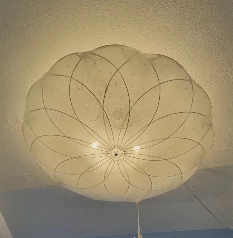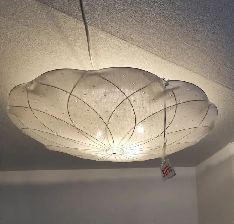 Den klassiska Pia-lampan som plafond. Lampan har en ställning av silvertråd och klädsel av vitt bomullstyg med hålbrodyr. Vi har en utställningslampa som vi rear till 30%