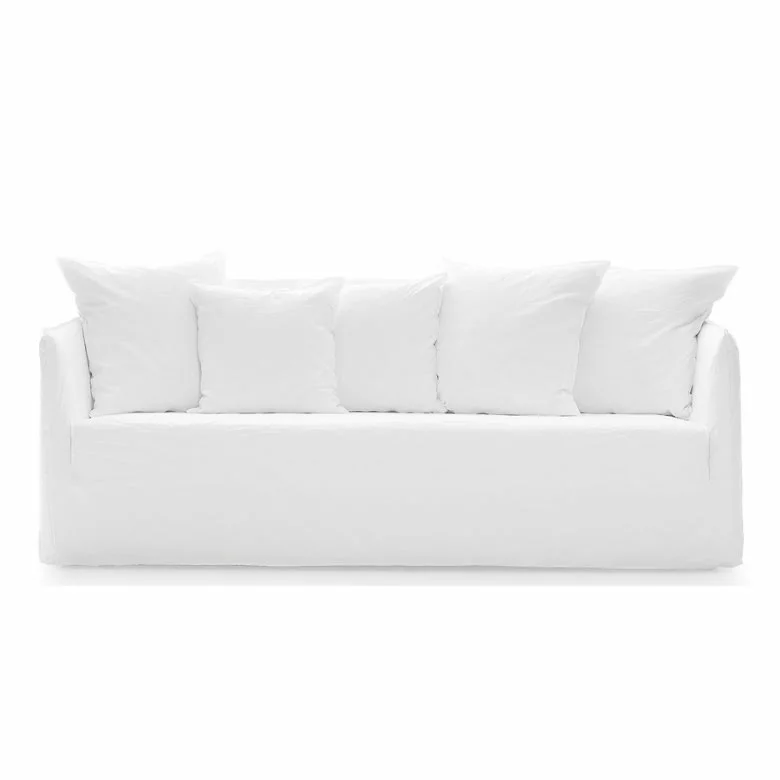 Soffa Ghost 10G i vit, förtvĂ€ttad bomull/lin. Tre ryggkuddar 60×60 cm och tvĂ„ ryggkuddar 50×50 i dun/dakron (vita) cm ingĂ„r.  Stomme samt kuddar har helt tvĂ€ttbar och avtagbar klĂ€dsel. Fler tyger och fĂ€rger finns att vĂ€lja pĂ„ i vĂ„r butik pĂ„ Birger Jarlsgatan.Â