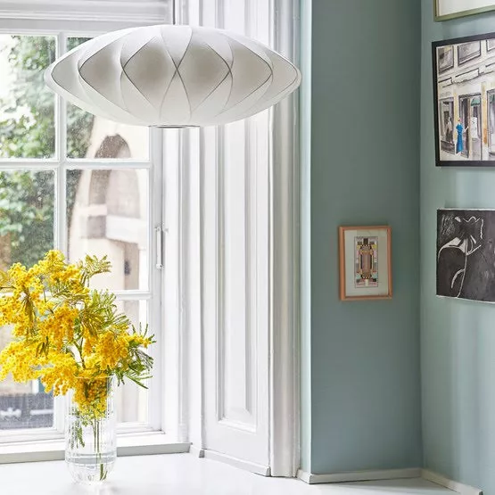 Nelson Saucer Cisscross Bubble Pendant Àr formgiven av amerikanska designern George Nelson 1947. Lampan producerades första gÄngen 1952 och distribueras frÄn och med 2019 av HAY för att hedra samarbetet med Herman Miller. Nelsons bubble lamp finns i flera olika former och storlekar.