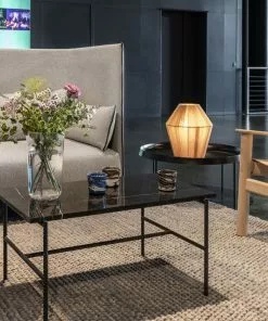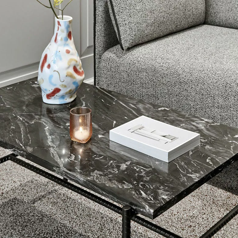 Bordets stativ flirtar med en grövre industrialistisk stil som tonas ner med toppskiva i mörk marmor. Serien Rebar består av flera olika soffbord och sidobord.