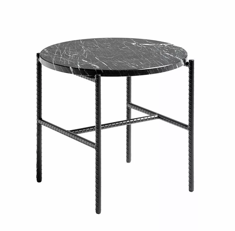Bordets stativ flirtar med en grövre industrialistisk stil med en toppskiva i mörk marmor alternativt pulverlackat stĂ„l. Serien Rebar bestĂ„r av flera olika soffbord och sidobord. Â