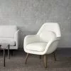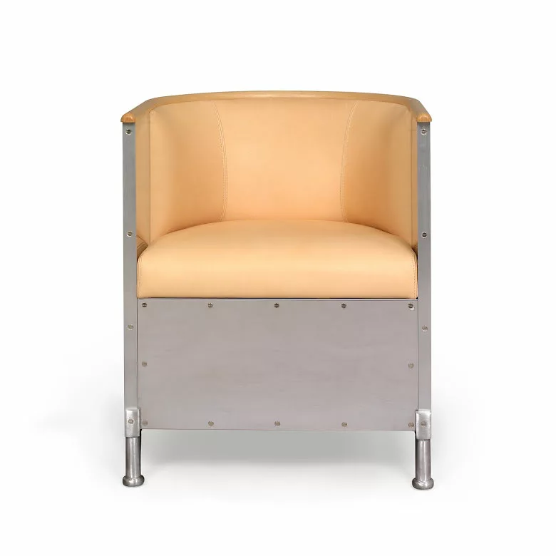 Material: Trästomme klädd i aluminium. Rygg i kallskum, sits i kallskum med Dymetrol. Klädsel i tärnsjöläder. Gjutna aluminiumben.
