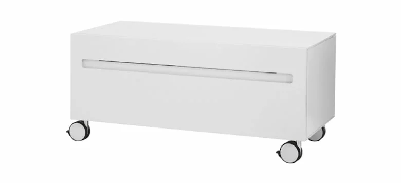 Stow mediabänk med sockel, hjul eller vägghängt. En lucka inklusive två flyttbara hyllplan. Urtag i rygg, botten, mellansidor och topp för kablar. Invändigt djup 41,6cm. Luckan har ett generöst handtag med dolt spår så att den elektroniska utrustningen kan fjärrstyras utan att luckan är öppen. Lådor kan beställas till Stow Mediabänk.