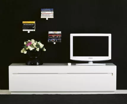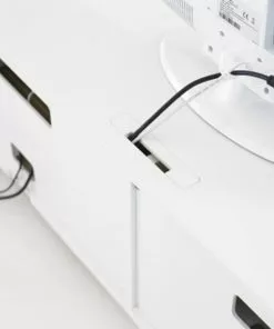 Stow mediabänk med sockel, hjul eller vägghängt. Två luckor inklusive två flyttbara hyllplan. Urtag i rygg, botten, mellansidor och topp för kablar. Invändigt djup 41,6cm. Luckorna har ett generöst handtag med dolt spår så att den elektroniska utrustningen kan fjärrstyras utan att luckan är öppen.