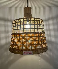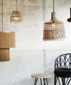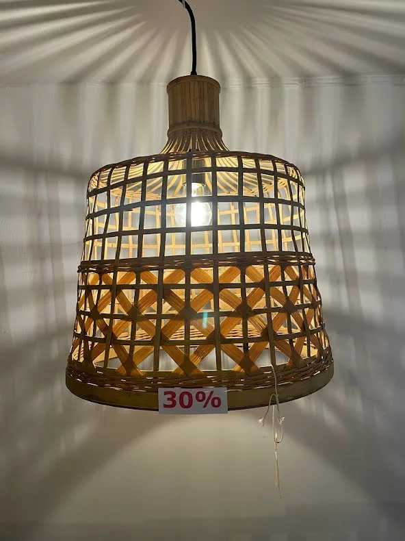 Vacker taklampa i bambu frĂ„n danska varumĂ€rket Madam Stoltz. D:40×46 cm. Den vackra flĂ€tningen sprider en fin mönsterbild i taket och rummet.Â