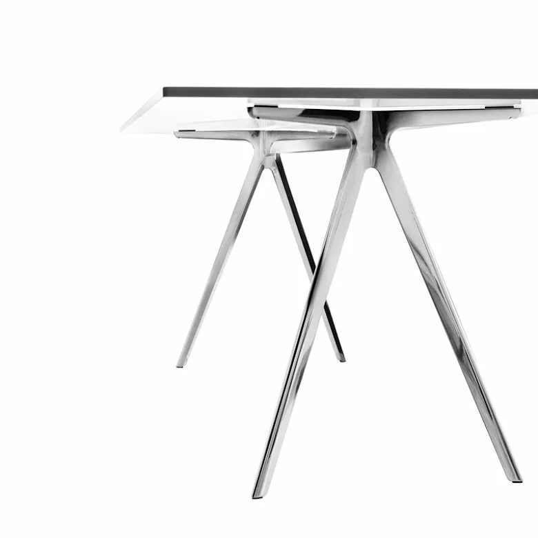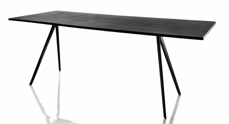 Baguette av Ronan och Erwan Bouroullec Àr en serie bord med elegant avsmalnande ben i gjuten aluminium, polerade eller mĂ„lade i vitt eller svart, och skivor i mattlackad MDF, valnöt, transparent eller mĂ„lat glas, italiensk Ardesia skiffer eller kvartsit. Versionen med skiffer har en rĂ„, strukturerad yta.Â