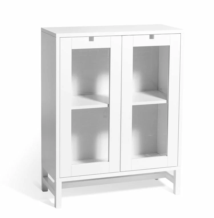 Material: MDF/Massivträ/härdat glas. MDF i stomme, härdat glas i dörrar. Massiv björk i benstativ.