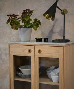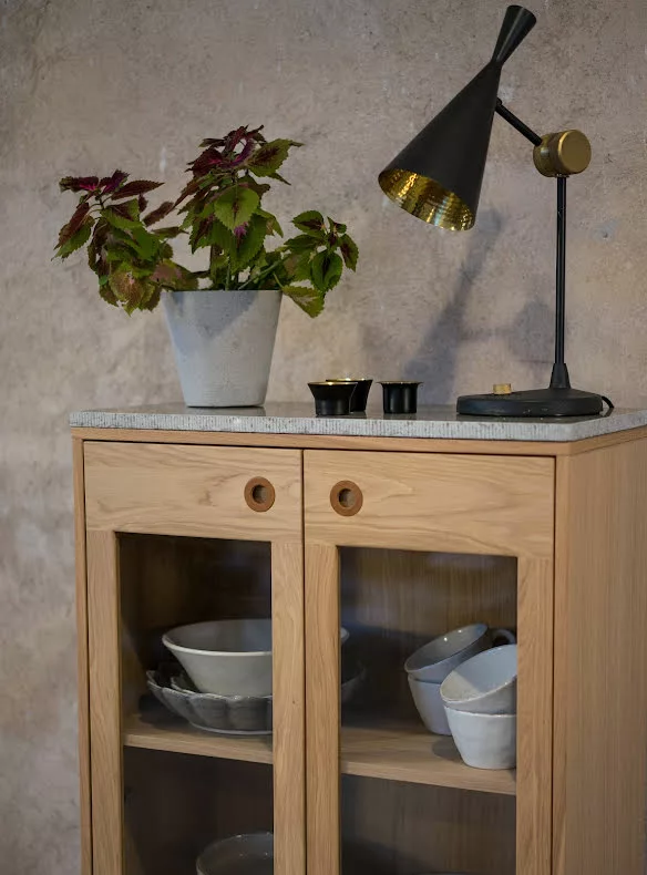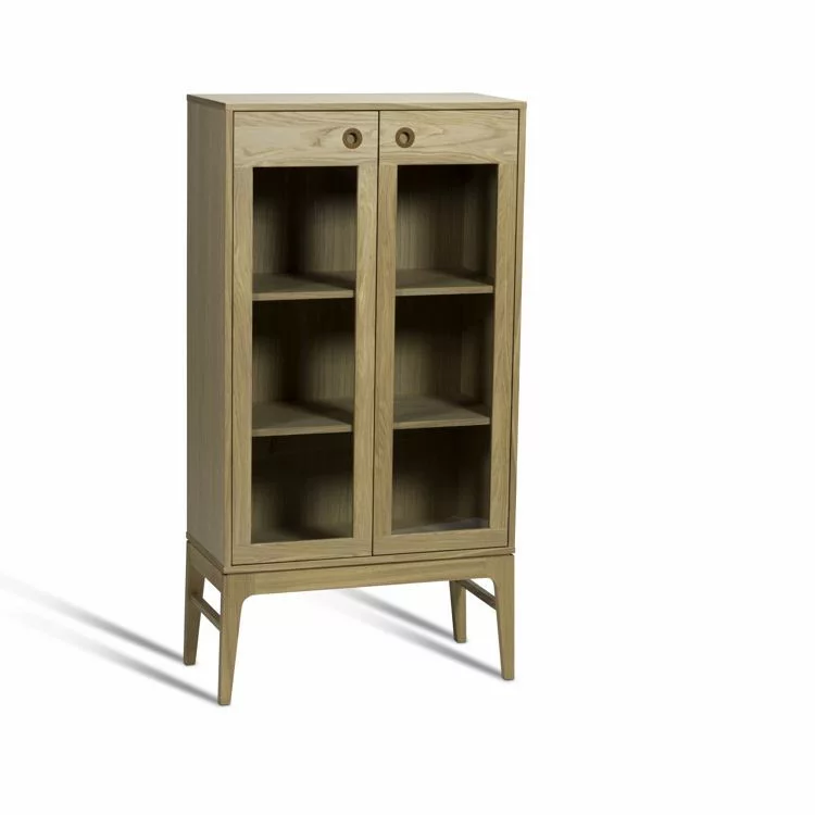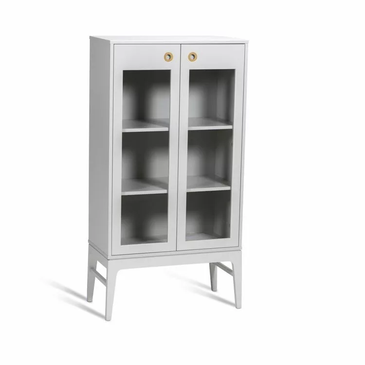 Höllviken skåp från Mavis är stram och skandinavisk, men samtidigt varm och omtänksam. Byrån har glasdörrar och två hyllplan, och precis som byråerna har skåpet detaljer i läder och sten. Höllviken skåp finns i ljusgrå lack eller vitpigmenterad mattlackad ek. Som tillval kan du välja mellan Italiensk Carraramarmor eller Svensk logerhuggen kalksten från Hällekis.