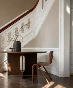 Androgyne Dining Table rund är ytterligare en tillökning för Danielle Siggeruds eleganta bordsserie Androgyne för Menu. Serien innefattar nu en rad olika soffbord och matbord, både med runda och rektangulära bordsskivor. Det runda matbordet finns i två olika storlekar, antingen 120 eller 150 cm i diameter. Bordet går att beställa antingen helt i ek eller i en mörkbetsad ek, det mindre bordet går även att få med toppskiva i Kunis Brescia marmor.