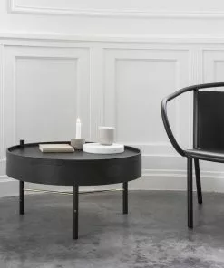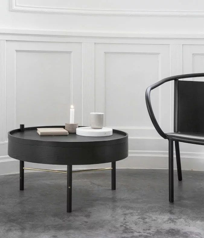 Turning table Ă€r ett litet sidobord alternativt soffbord med dold förvaring frĂ„n danska Menu. Du döljer lĂ€tt fjĂ€rrkontrollen, tv-bilagan eller annat som du vill ha nĂ€ra till hands. Toppskivan roterar runt ett av bordsbenen och metallstagen mellan benen ger elegans och stabilitet.Â