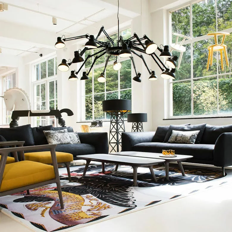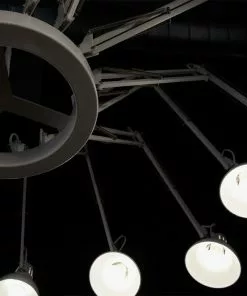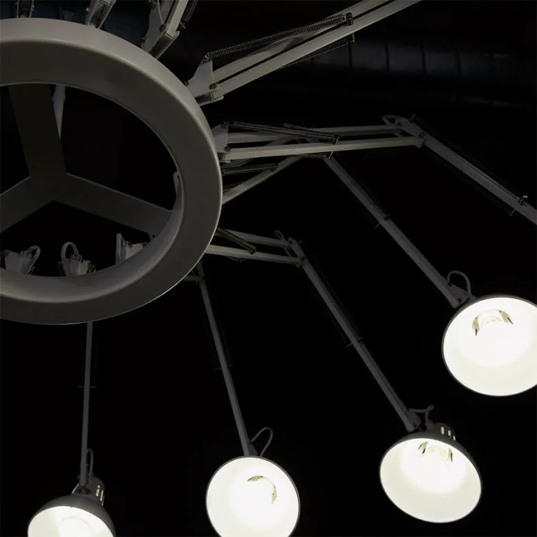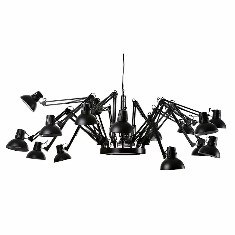 Denna lampa Ă€r uppbyggd av 16 stycken lampor liknande den klassiska skrivbordslampan, sammansatta till en flexibel och spĂ€nnande ljuskrona. SkĂ€rmarna kan vinklas för att fĂ„ fram bĂ€sta möjliga funktion samt för att hitta den perfekta visuella formen. Dear Ingo storlek kan variera mellan 80 till 240 centimeter i diameter.Â