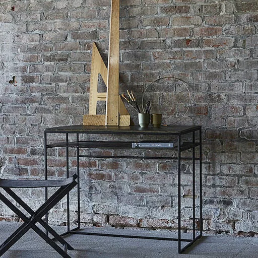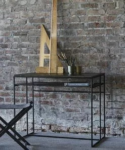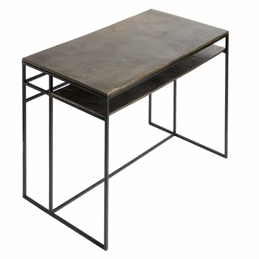 Skrivbordet Hitch frĂ„n danska Muubs Ă€r gjort av stĂ„l med en antik mĂ€ssingsskiva. Skrivbordet Ă€r designat i ett enkelt och stilrent utförande som gör att det passar lika bra i alla rum. Under bordsytan finns en hylla gjord av samma material. Varje mĂ€ssingsskiva Ă€r har en unik finish dĂ„ den Ă€r gjuten i sand vilket gör varje bord unikt.Â