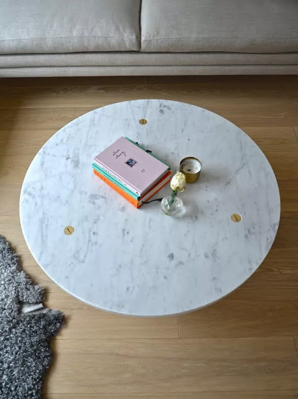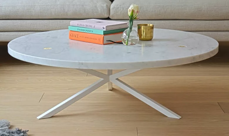 Soffbordet i marmor frĂ„n No Early Birds har de karaktĂ€ristiska kryssbenen i metall samt de runda brickorna i mĂ€ssing. Finns i tvĂ„ höjder, 33 eller 46 cm.Â