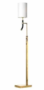 Butler golvlampa finns i rå mässing, svartlackerad stomme med svart läder eller vitlackerad stomme med vitt läder. Dubbla brytare. Cylinderskärm i offwhite eller svart chinette. Butler finns även som bordslampa och vägglampa.