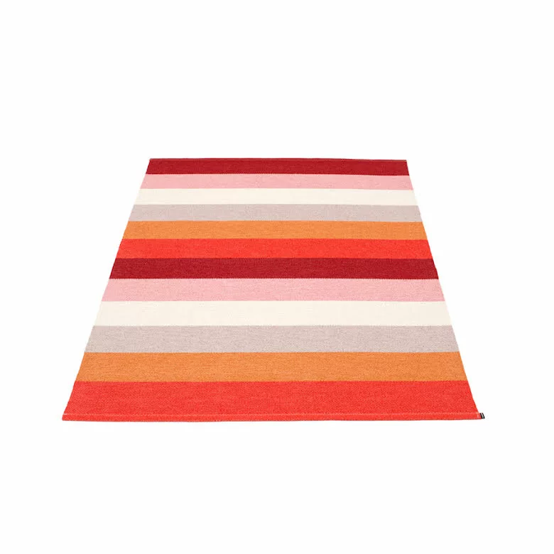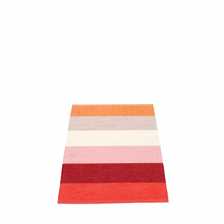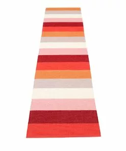 Pappelinas mattor vĂ€vs pĂ„ ett traditionellt vĂ€veri i Sverige. Att vĂ€va i plast Ă€r en svĂ„r och lĂ„ngsam process dĂ€r hantverket stĂ€ndigt Ă€r nĂ€rvarande. Plastmatta Sunset har rĂ€nder i röda, orange och rosa toner.Â