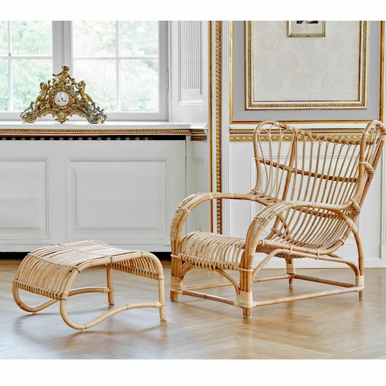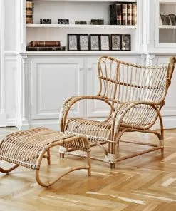En fotpall till Viggo Boesens fÄtölj Teddy frÄn 1936. Fotpallen Àr handgjord i hÄllbar indonesisk rotting och vÀvd av skickliga rottingmakare.