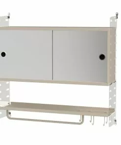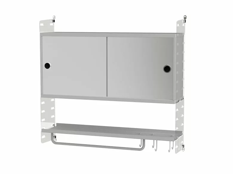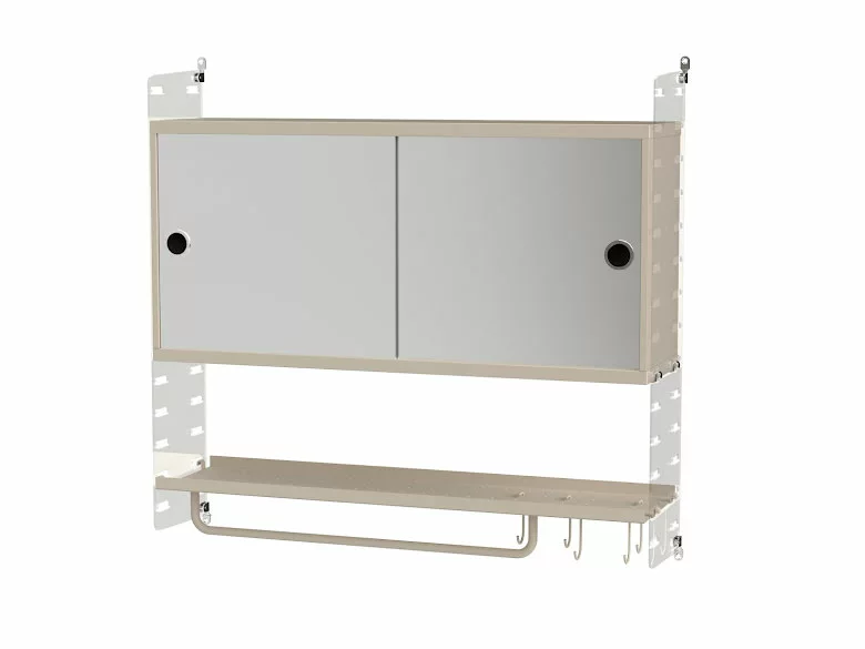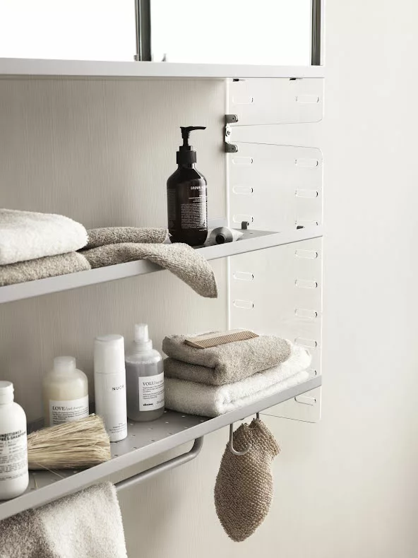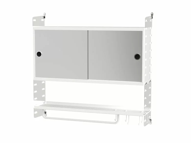 Ett vÀggmonterat hyllsystem perfekt för det mindre badrummet. Denna kombination innehÄller vÀggavlar i genomskinligt plexiglas, ett hyllplan i metall med lÄg kant, en stÄng, J-krokar samt ett skÄp med spegeldörrar. I skÄpet har du utrymme till att förvara alla dina toalettartiklar.