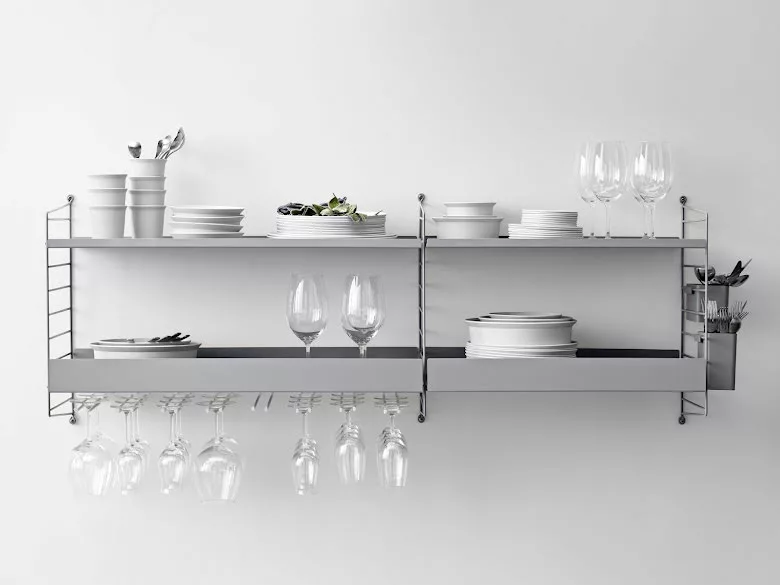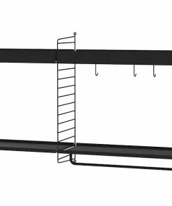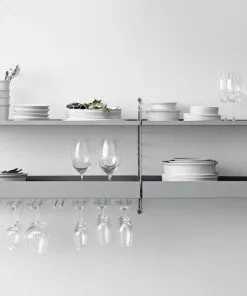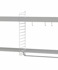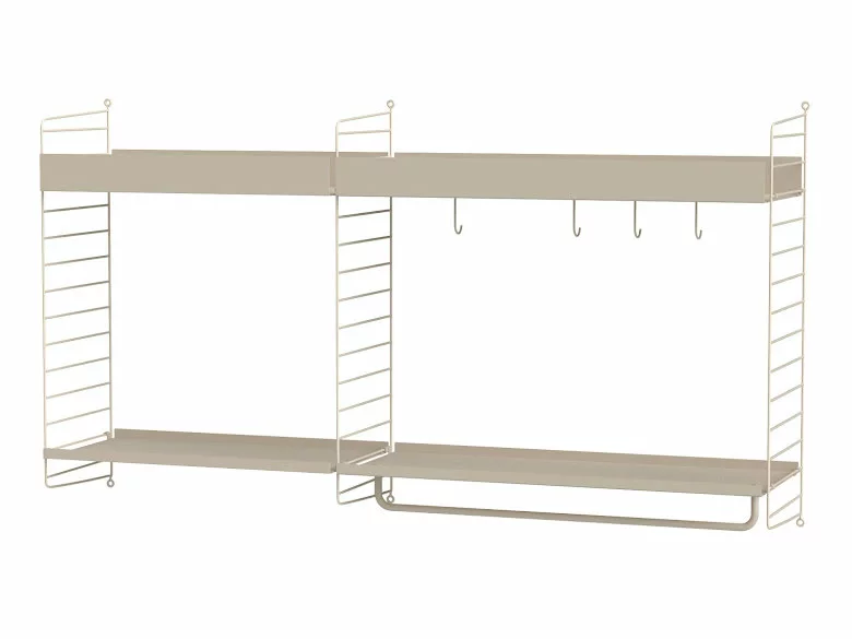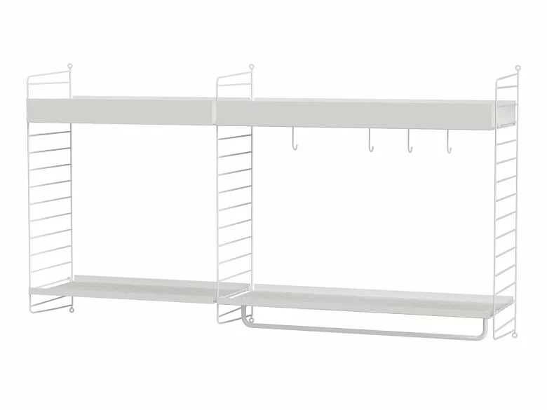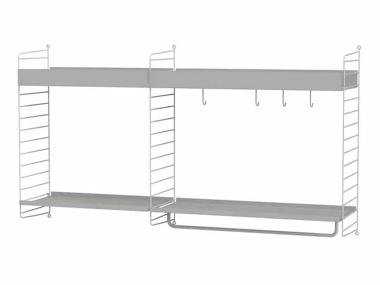 En komplett kökshylla med möjligheten att förvara dina köksprylar på antingen hyllplan eller genom att hänga dem från krokarna eller stängerna. Denna kombination innehåller väggavlar, metallhyllplan med hög och låg kant, en stång och J-krokar