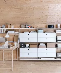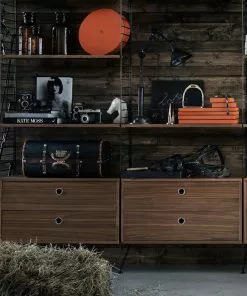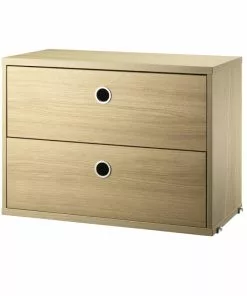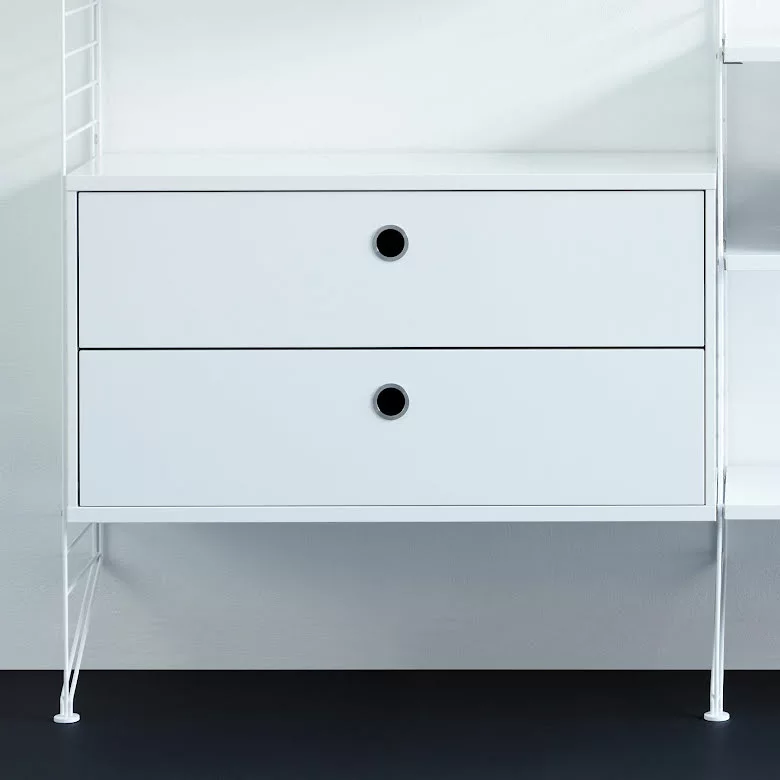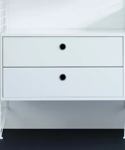 String lådhurts har två lådor och finns i två bredder, 58 och 78 cm. Djupet är 30 cm och passar då till String gavel med 30 cm djup, vägg eller golv. Lådhurtsen levereras omonterad, monteringsanvisning medföljer. Handtaget är i rostfritt stål.