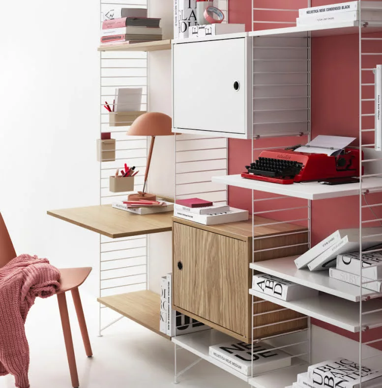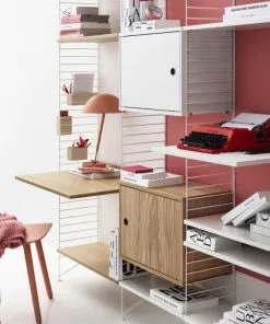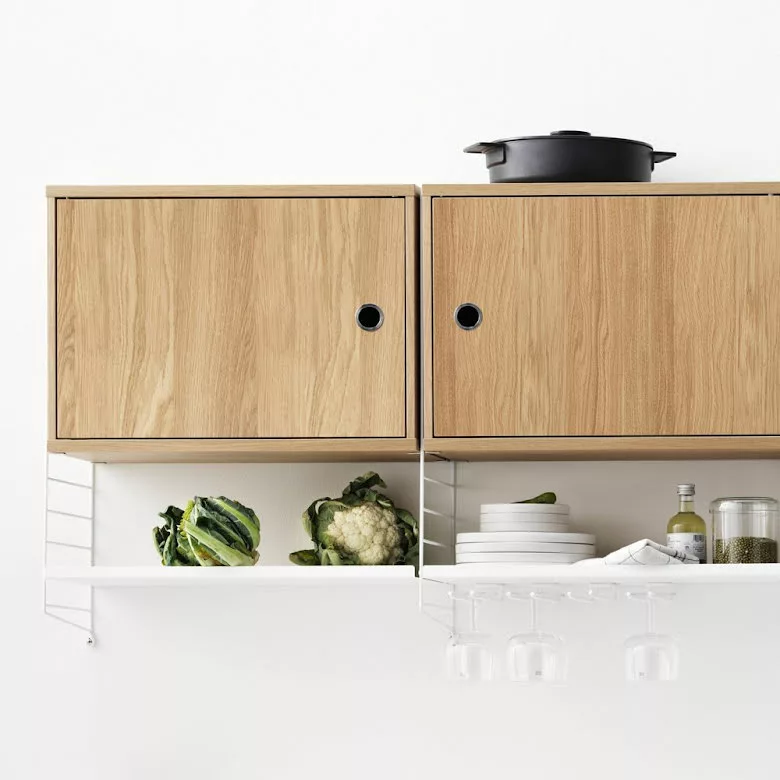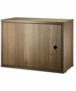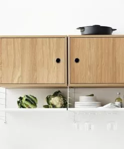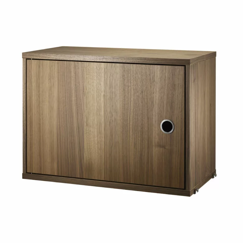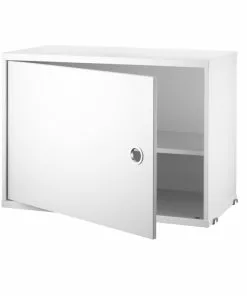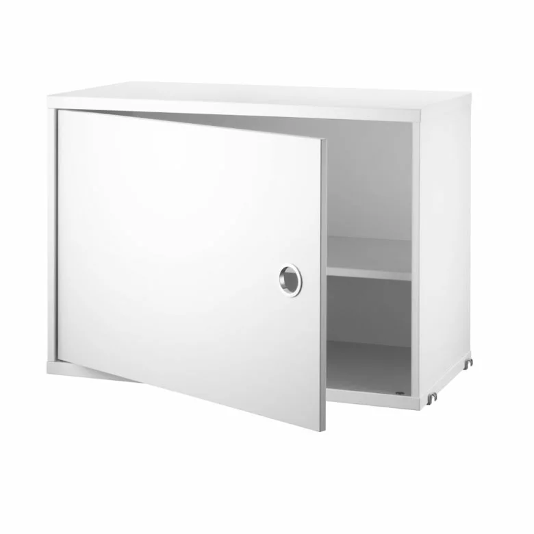 String skåp med lucka finns i bredden 58 cm. Djupet är 30 cm och passar då till String gavel med 30 cm djup, vägg eller golv. Skåpet levereras omonterat, monteringsanvisning medföljer. Handtaget är i rostfritt stål.
