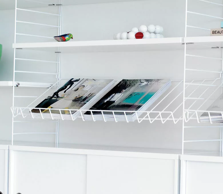 String tidskriftshylla fungerar med 30 cm djupa gavlar, och blir ett fint komplement i hyllan. Köp till hyllplan, skÄp, lÄdhurts, arbetsskiva eller tidsskriftshylla och bygg din Stringhylla precis som du vill ha den. Man kan enkelt bygga ut sin Stringhylla efter hand genom att köpa till fler delar.