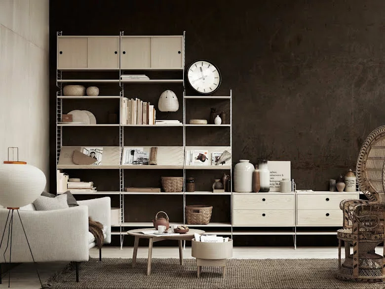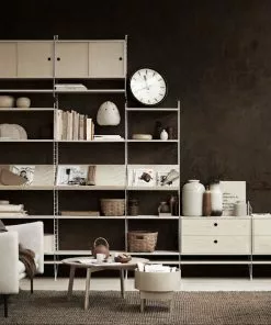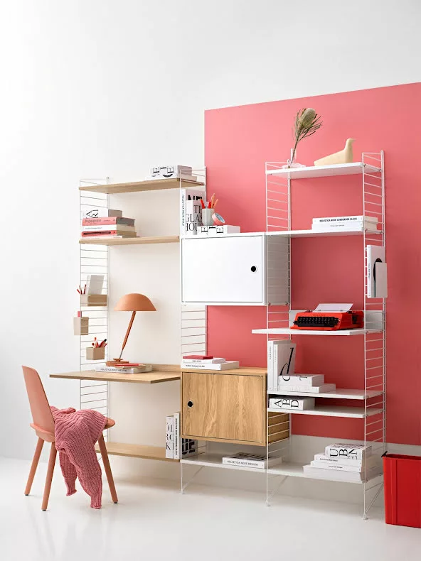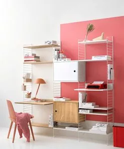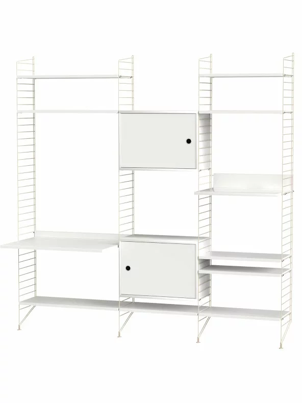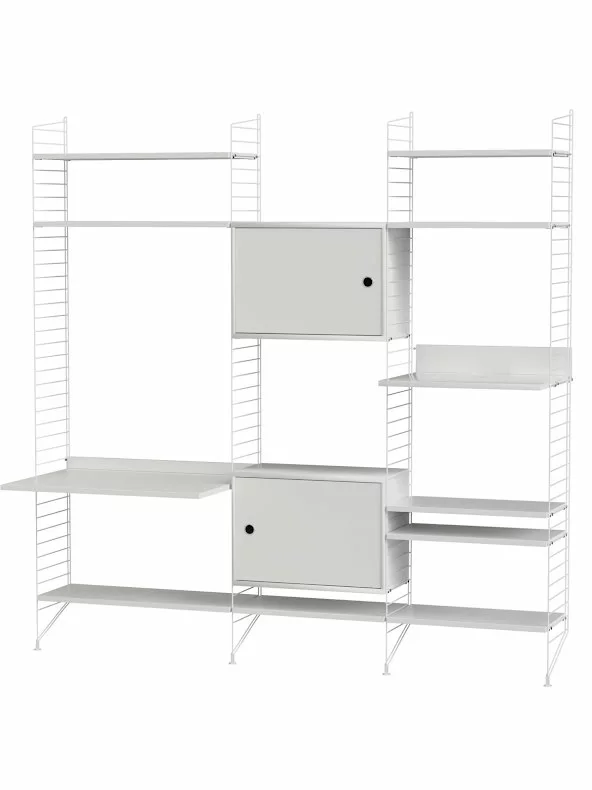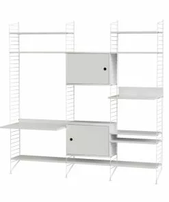 En större kombination av golvgavlar, hyllor, metallhyllor med lÄg kant, skÄp med dörr, mediahylla och arbetsbord. Den perfekta balansen mellan öppet förvaringsutrymme och dolt förvaringsutrymme, vilket gör att hyllan passar lika bra i vardagsrummet som i arbetsutrymmet.