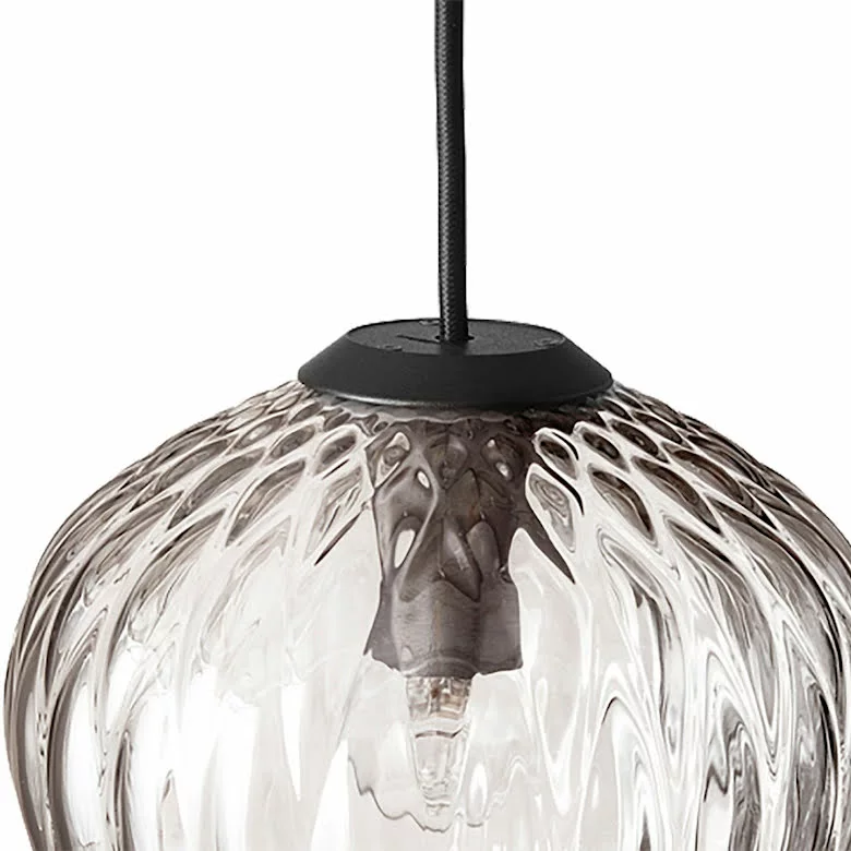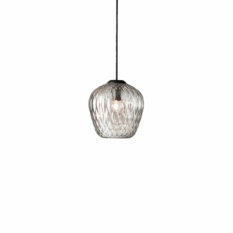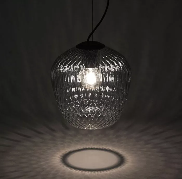 En munblÄst pendel med ett quiltat mönster. Ljuset bryts vackert nÀr ljuskÀllan omges av mönstrat glas. Den genomskinliga lampan förvandlar det utrymme som den bebor med invecklade strukturer och mönster.