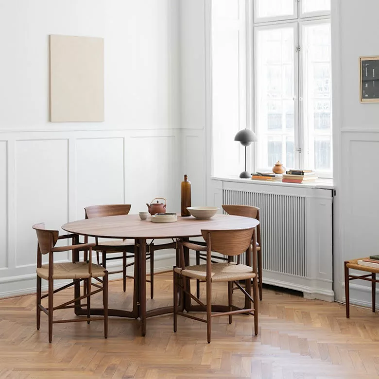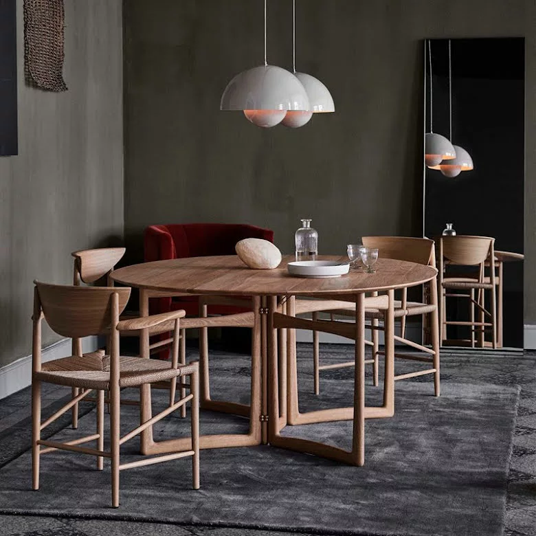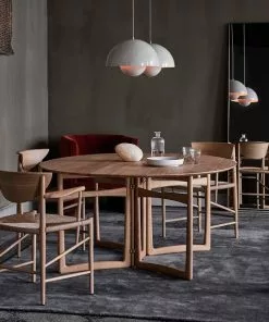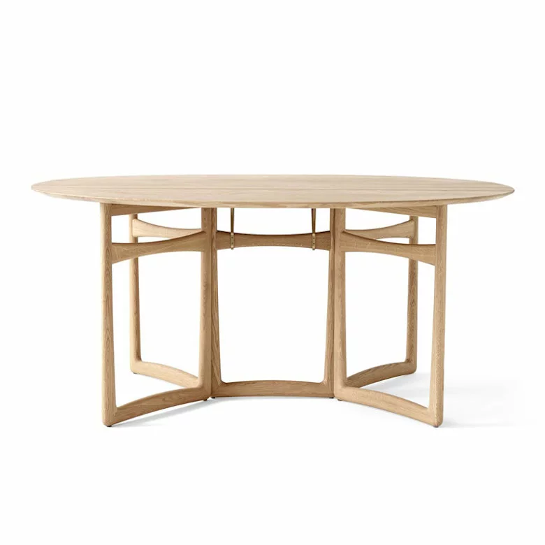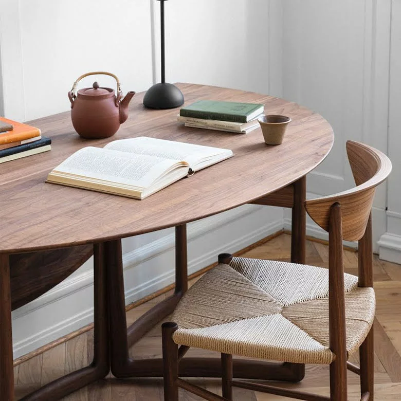 För att skapa ett mĂ„ngsidigt stycke som skulle anpassa sig till sin omgivning, designade designduon Hvidt & MĂžlgaard detta stiliga matbord 1956. Som en del av Drop Leaf-serien frĂ„n &Tradition har den samma böjda trĂ€ramar och lĂ€tt vikbar design. Finns i massiv valnöt eller ek.Â
