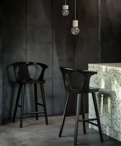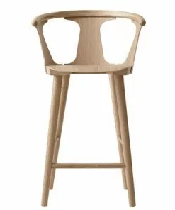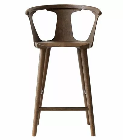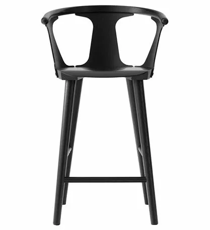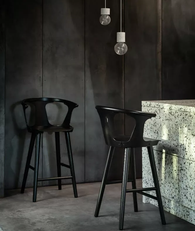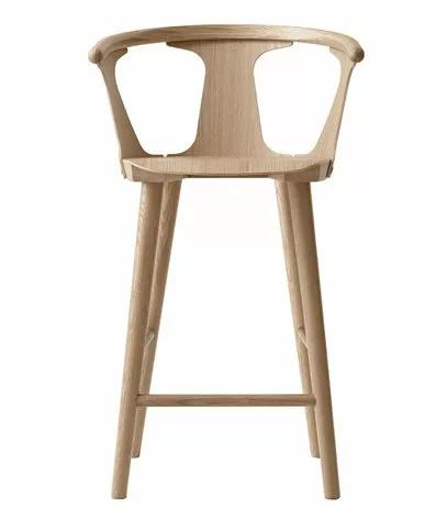 In Between barstol frĂ„n &Tradition kombinerar modern industriell tillverkning med traditionellt hantverk. Samspelet mellan positiva och negativa utrymmen Ă€r centrala i stolen. Rygg och sidopaneler ger konkret form och stöd, men formen skapas lika mycket av luckorna mellan panelerna. Den finns i tvĂ„ höjder.Â