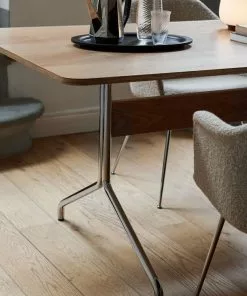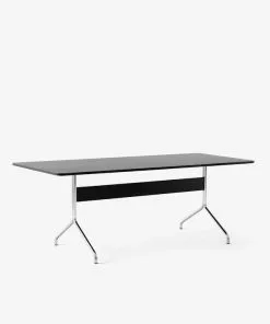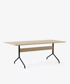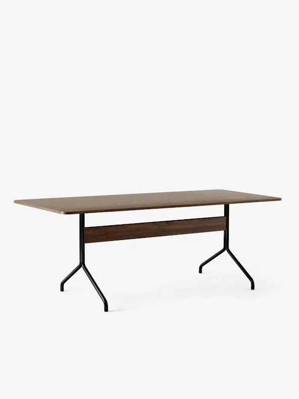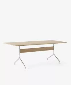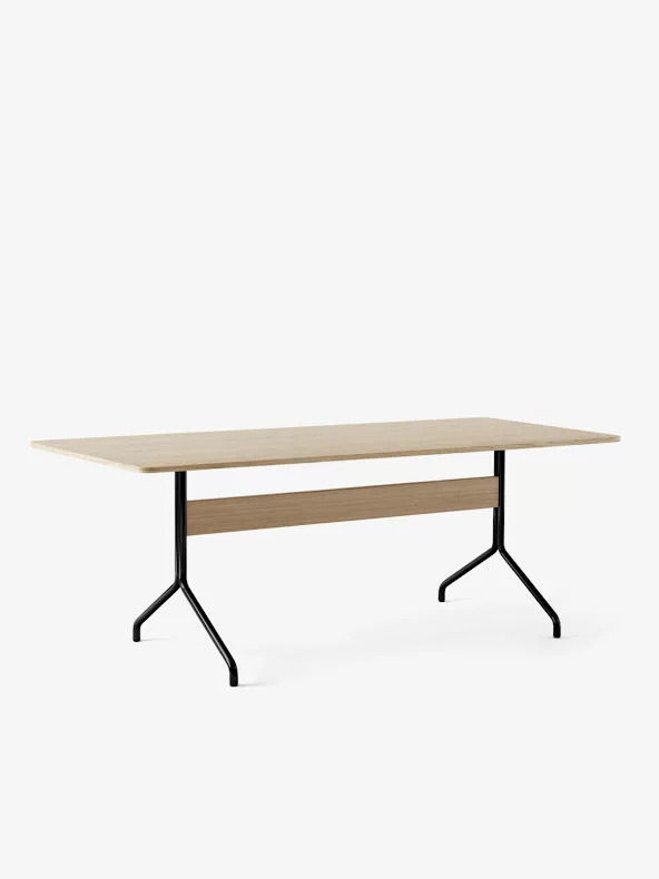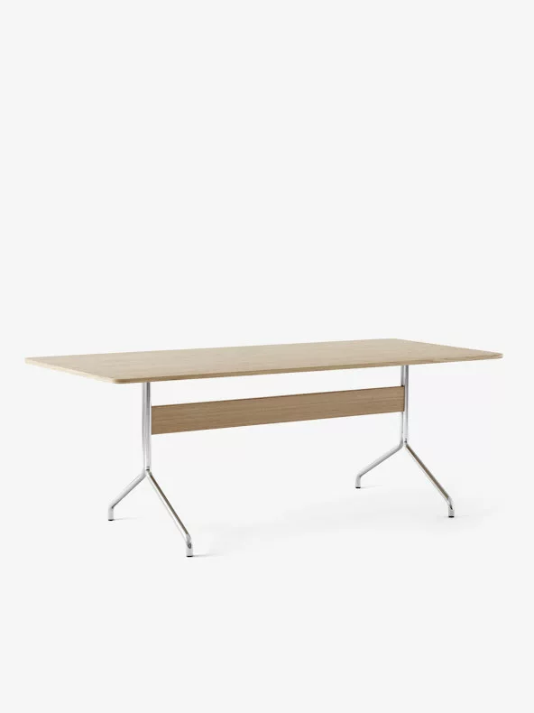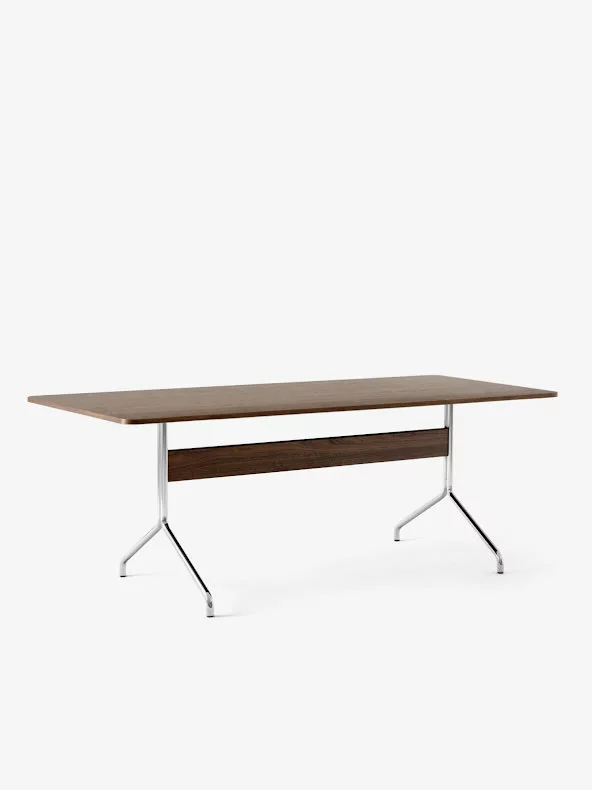 Ursprungligen designad för att vara en stol som kunde tillgodose massor av sittplatser, har Anderssen & Voll fortsatt att utöka sitt Pavilion-sortiment med en serie professionella skrivbord och nu ett matbord. Matbordet bibehÄller den ursprungliga ljusa och lyriska estetiken frÄn tidigare stycken, och har en bordsskiva och bÄr i trÀfanér och en bas i krom eller pulverlackerad, svart metall.