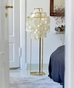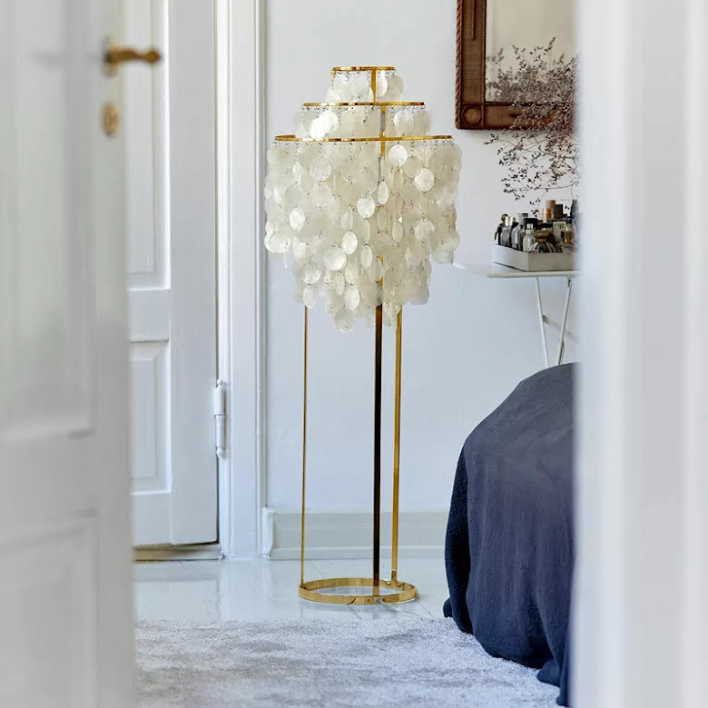 Fun 1STM designad av Verner Panton för Verpan Ă„r 1964 Ă€r en underbar golvlampa bestĂ„ende av diskar i pĂ€rlemor som hĂ€nger fritt frĂ„n tre metallringar. Denna lampa ger ett mjukt och behagligt ljus i alla rum och vid rörelse skapar pĂ€rlemorplattorna en melodi likartat ett vindspel. Fun 1STM finns i bĂ„de krom och mĂ€ssing.Â