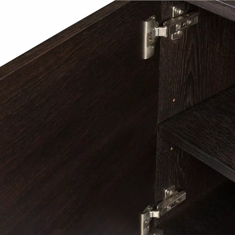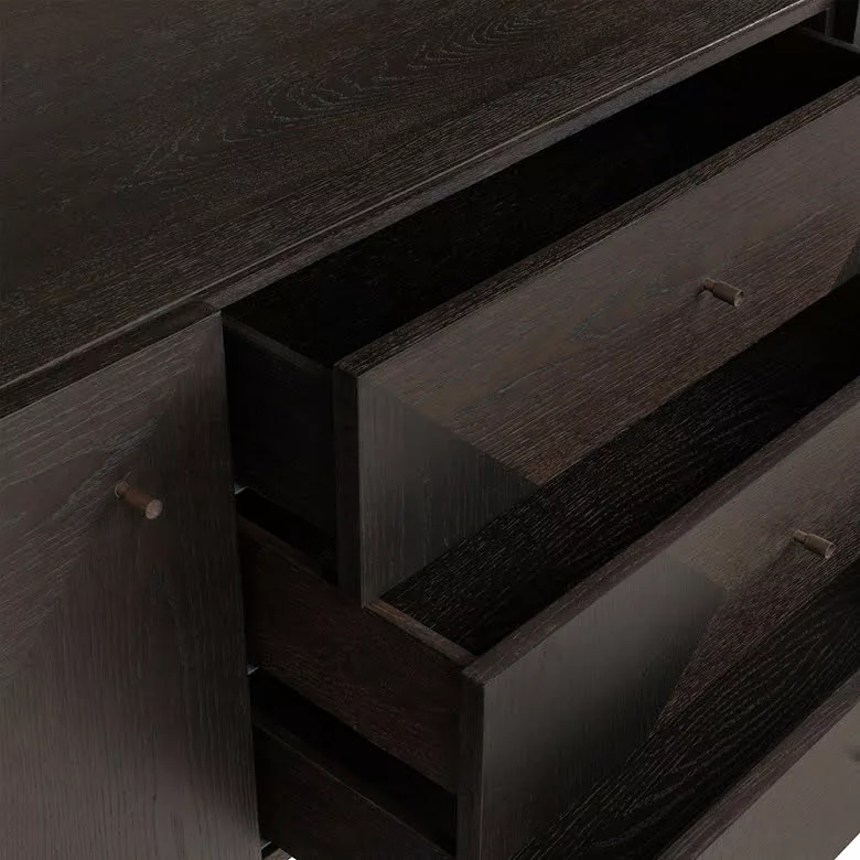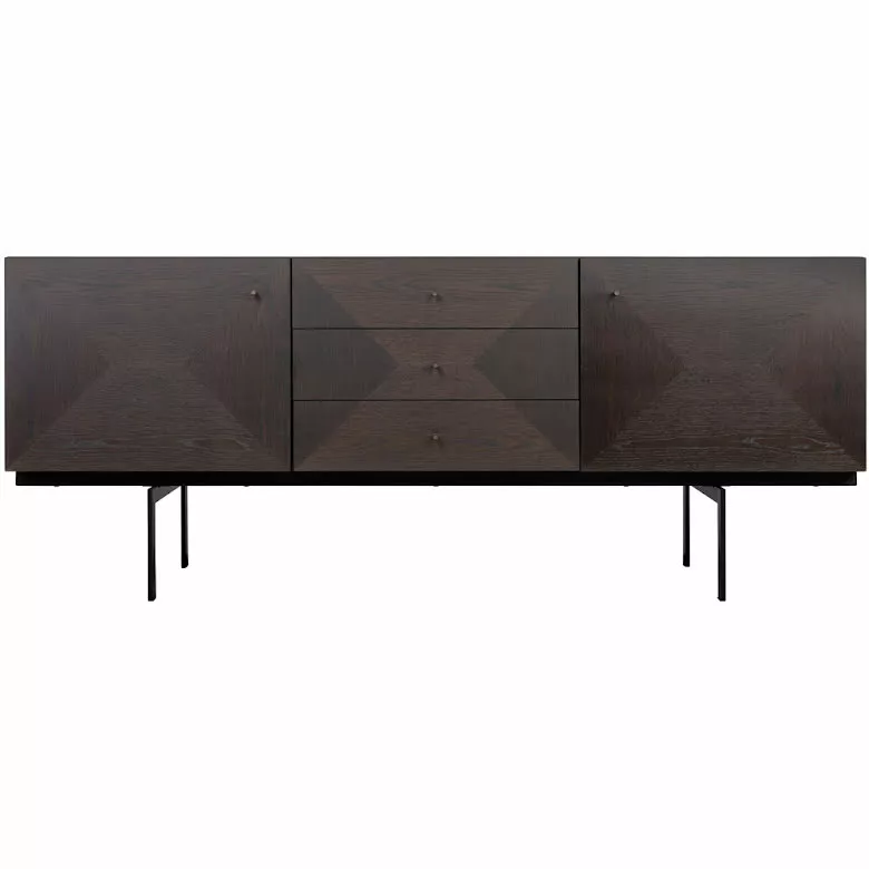 Capetown sideboard Ă€r tillverkat av ekfanĂ©r i en mustigt mörkbrun fĂ€rg och med ett stativ i svartlackat jĂ€rn. SkĂ€nken Ă€r hela 200 cm bred och har bĂ„de lĂ„dor och skĂ„p. Capetown-serien innehĂ„ller Ă€ven andra möbler.Â
