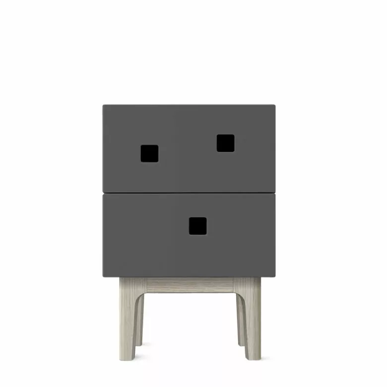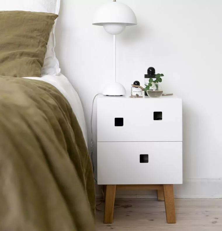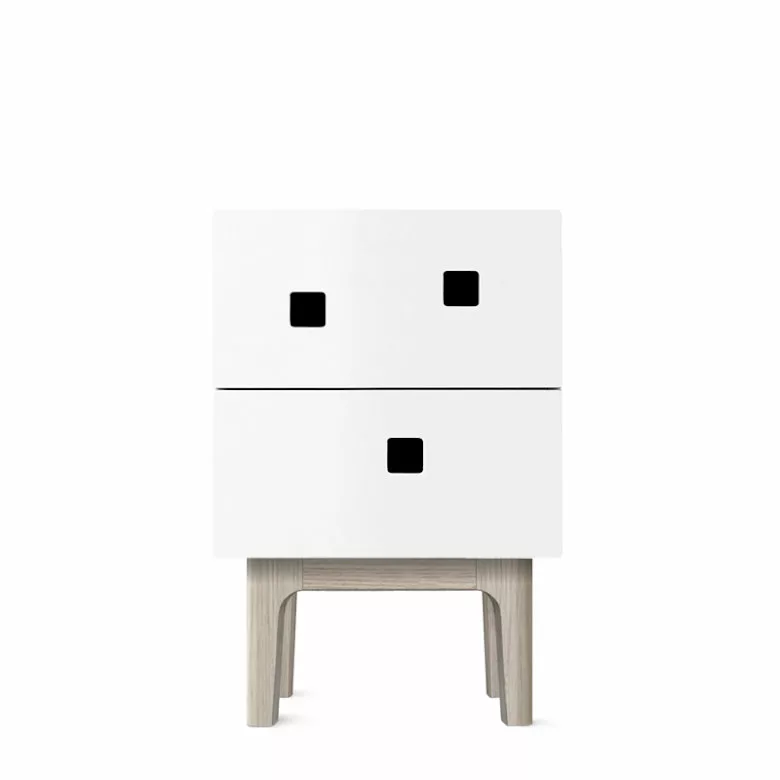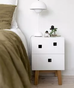 Peep är en serie skåp från Zweed som andas traditionell skandinavisk estetik, men som med sina asymmetriska former skapar ett helt unikt uttryck. Sängbordet Peep S1 har två lådor och ett utrymme på ovansidan där du gömmer sladdar och laddare. Du kan välja mellan vägghängt eller med benstativ i ek.